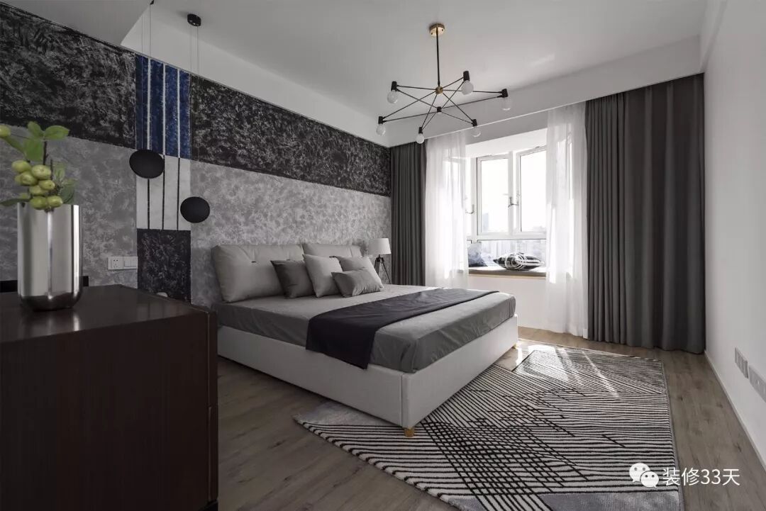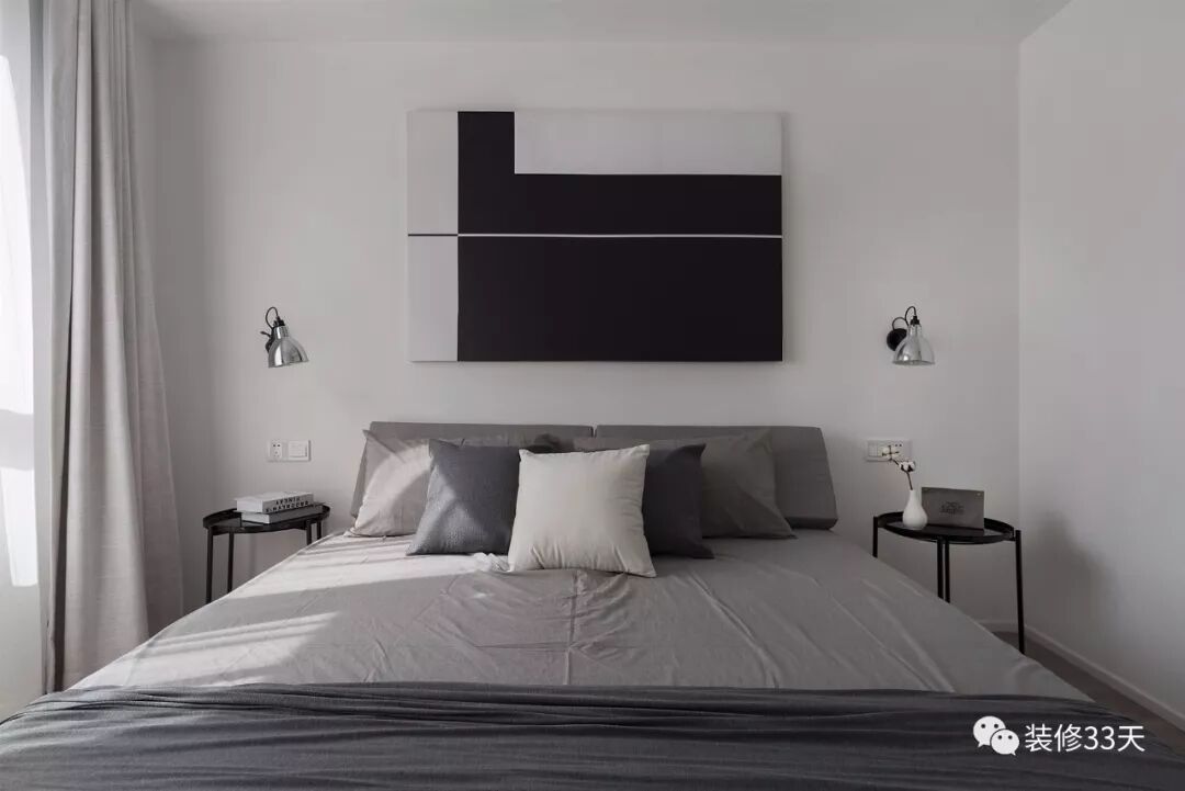 ▲ 客卧,整体留白的空间,通过黑白灰软装呈现简洁明快的空间感