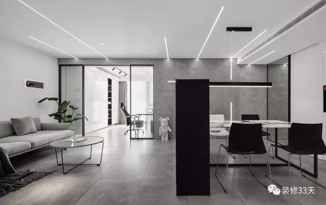 ▲ 电视墙不仅设计极简,还划分了客餐厅,线条灯从顶面延续至水泥肌理漆墙,打造出利落清爽的氛围