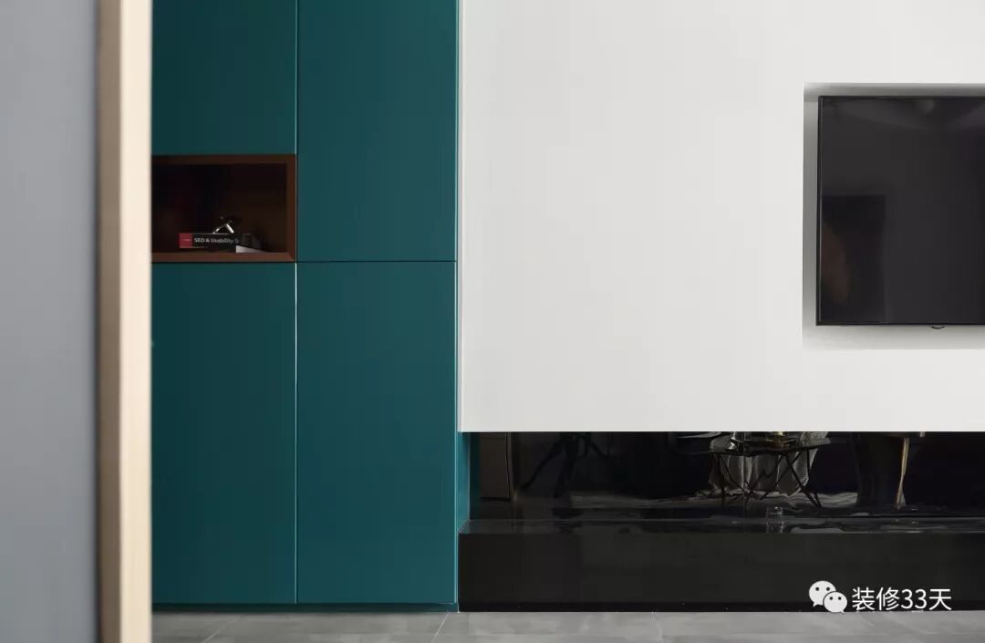 ▲ 蓝绿色柜体与客厅电视背景墙的大量留白形成趣味碰撞,简约不简单