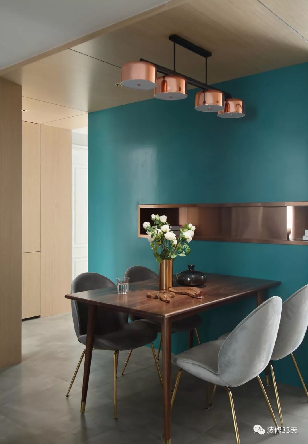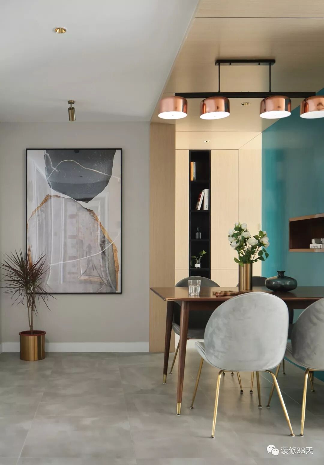 ▲ 餐厅,实木餐桌搭配深浅灰系丝绒餐椅,玫瑰金与蓝绿色巧妙穿插于空间中成点睛之笔
