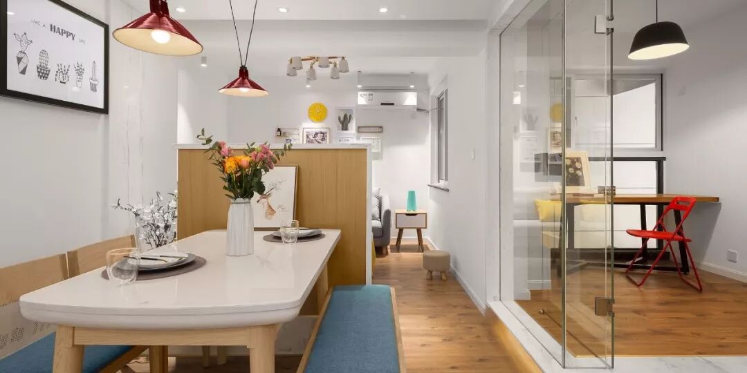 南舍设计其他作品推荐,点击下图查看玻璃书房、多功能矮墙、斜切门,95平三室努力提高利用率