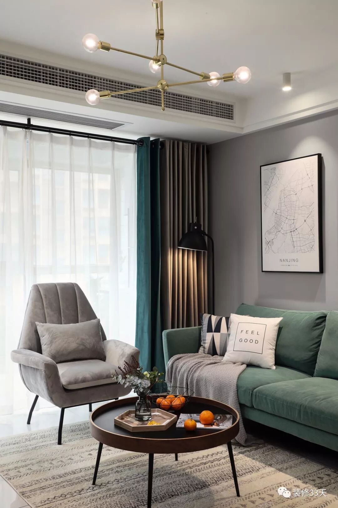 ▲ 大量的灰色墙面安静的陪衬着墨绿色的沙发,灰色的窗帘布搭配墨绿色的丝绸布艺,让整个空间都安静下来