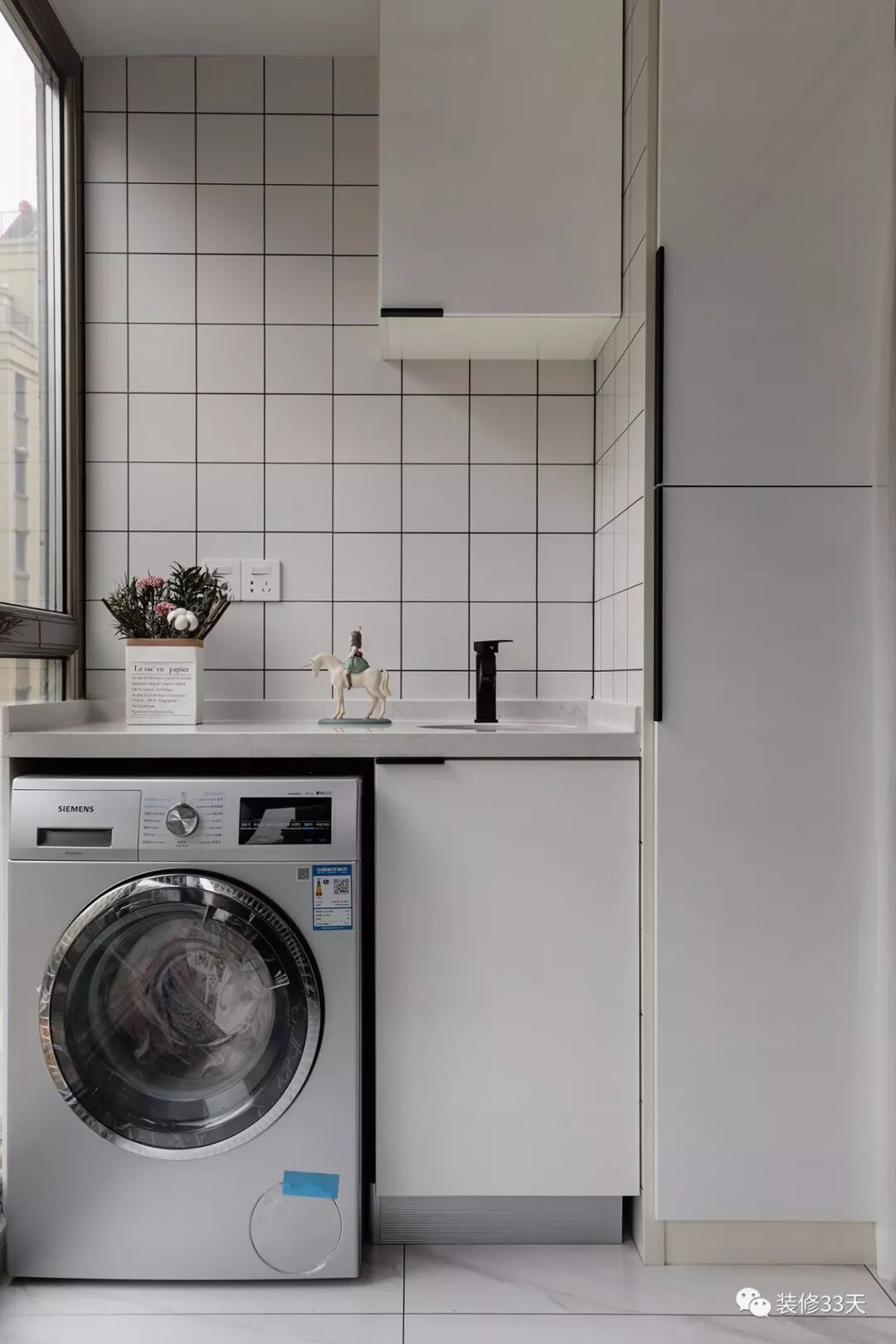 ▲ 客厅串连阳台,增加采光与使用空间,简洁的收纳柜搭配小白砖,打造实用的洗衣区