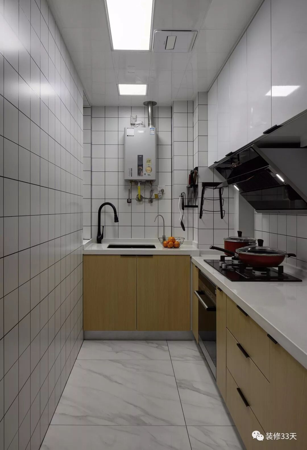 ▲ 厨房,小白砖搭配黑色美缝,不同色彩的柜门搭配层次分明,错落台面更具人性化设计