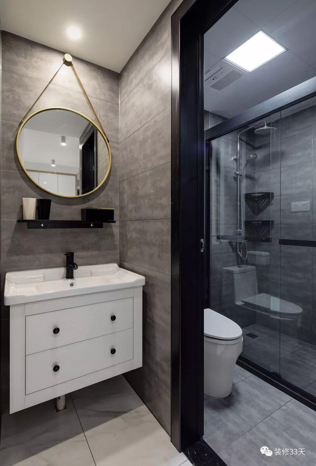 ▲ 卫生间采用黑白灰经典配色,点缀金色元素墙镜,干湿分区,提高使用效率