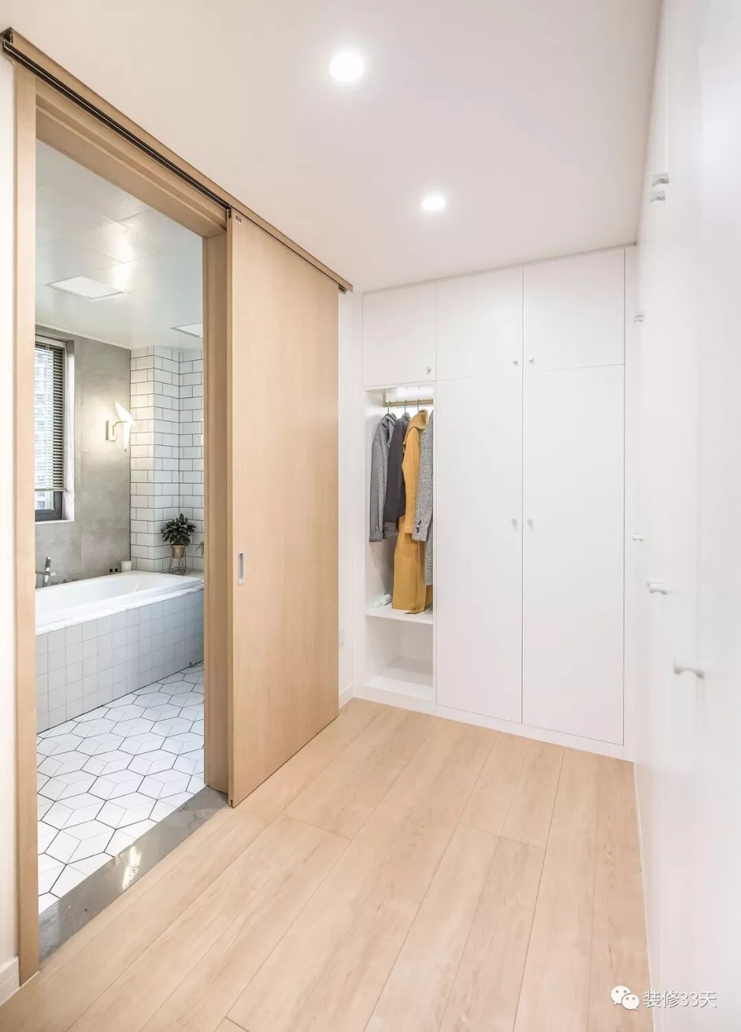 ▲ 将衣帽间和主卫打通,用木质移门隔断
