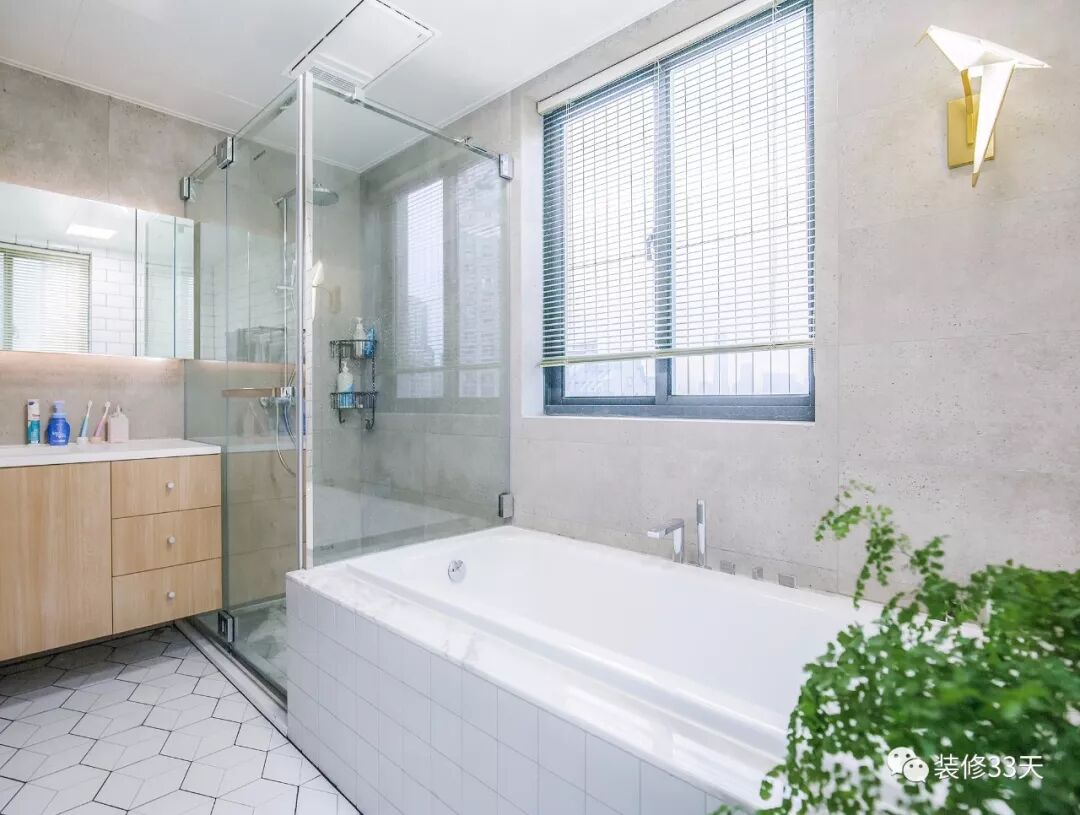 ▲ 主卫地面采用六角形砖,增加了淋浴区域,木质洗漱柜简洁大方,浴缸上面的Perch Light 通透灵动