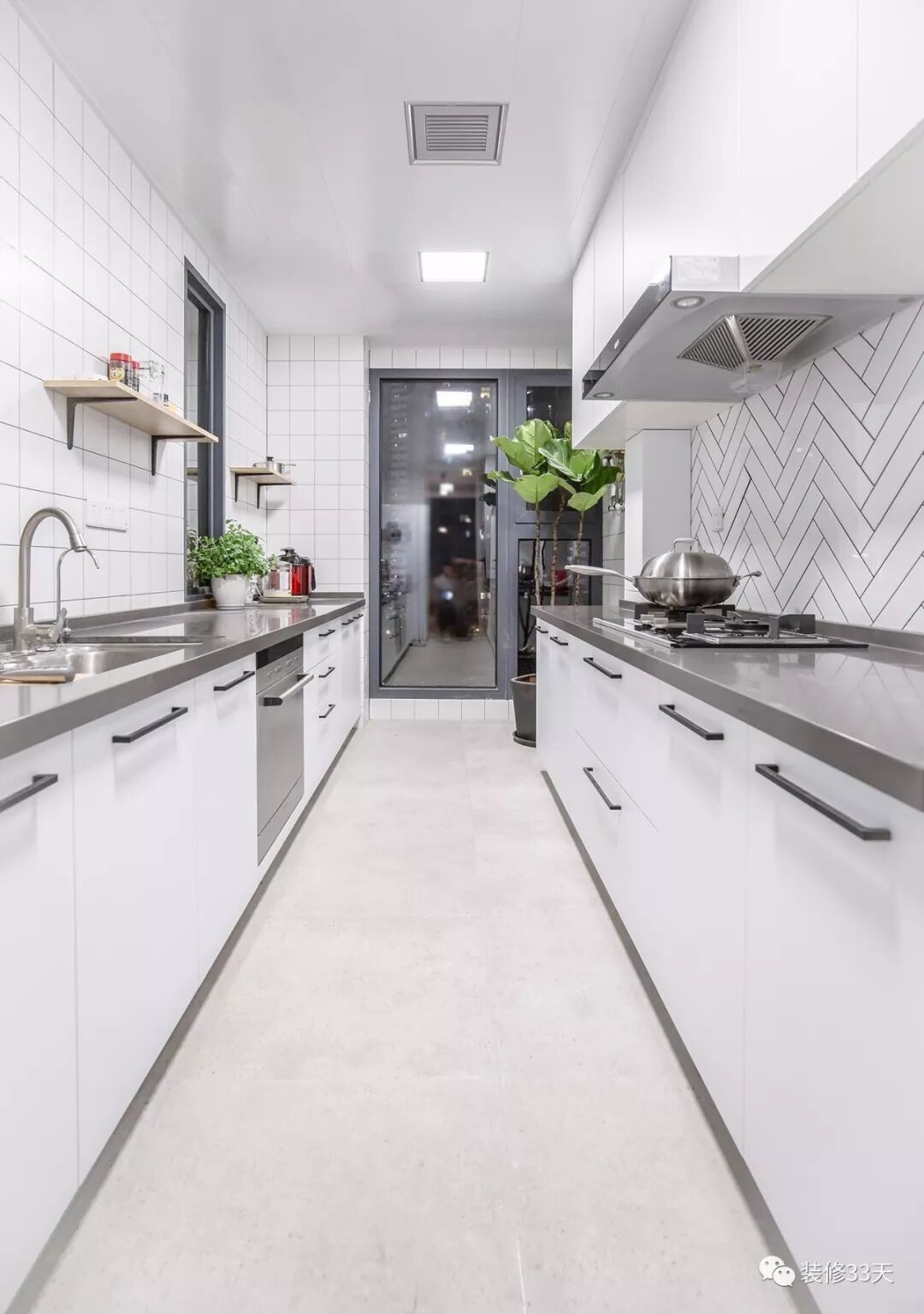 ▲ 把阳台并入厨房,扩大空间,两排白色的橱柜搭配灰色台面