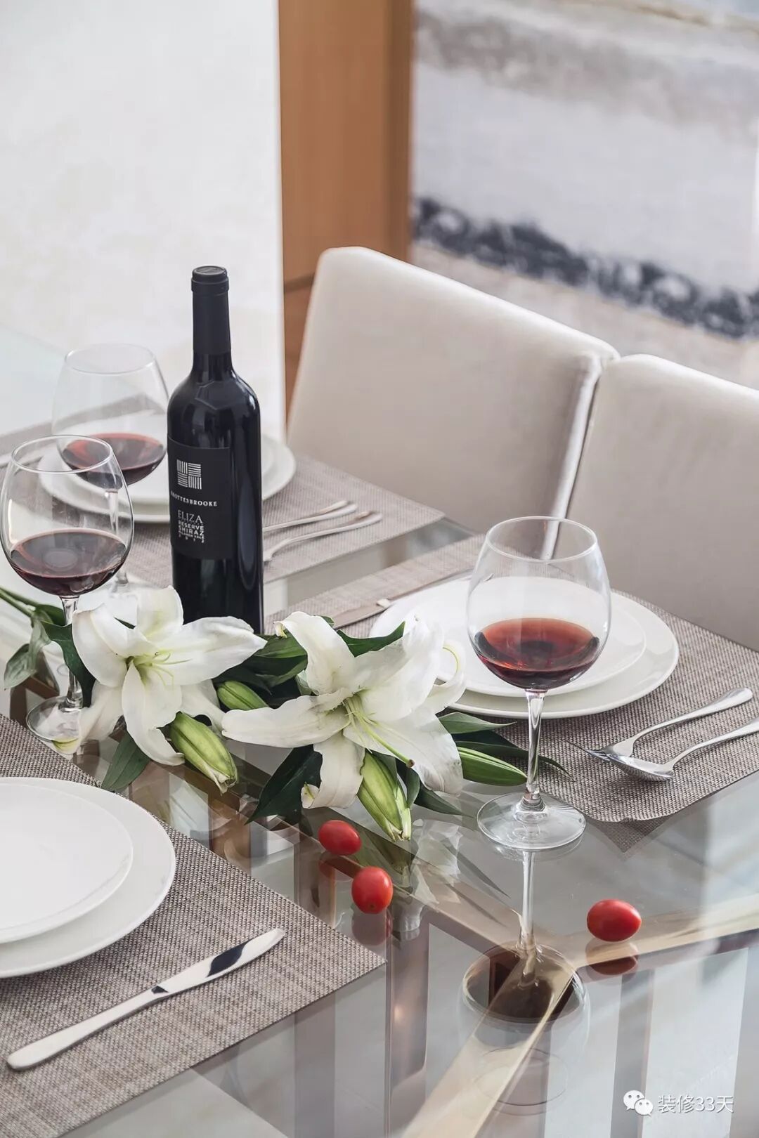 ▲ 玻璃餐桌靠墙放置留出宽敞过道,精致餐桌布置