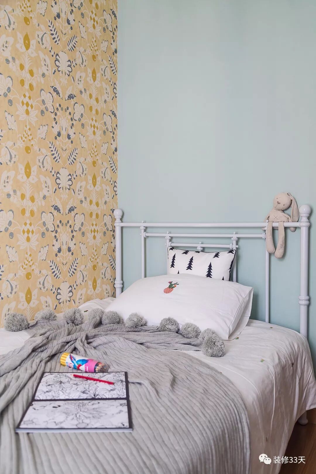 ▲ 儿童房,绿色墙面铺贴一面亮黄色花样壁纸,跳跃的色彩让孩子的空间更具活力