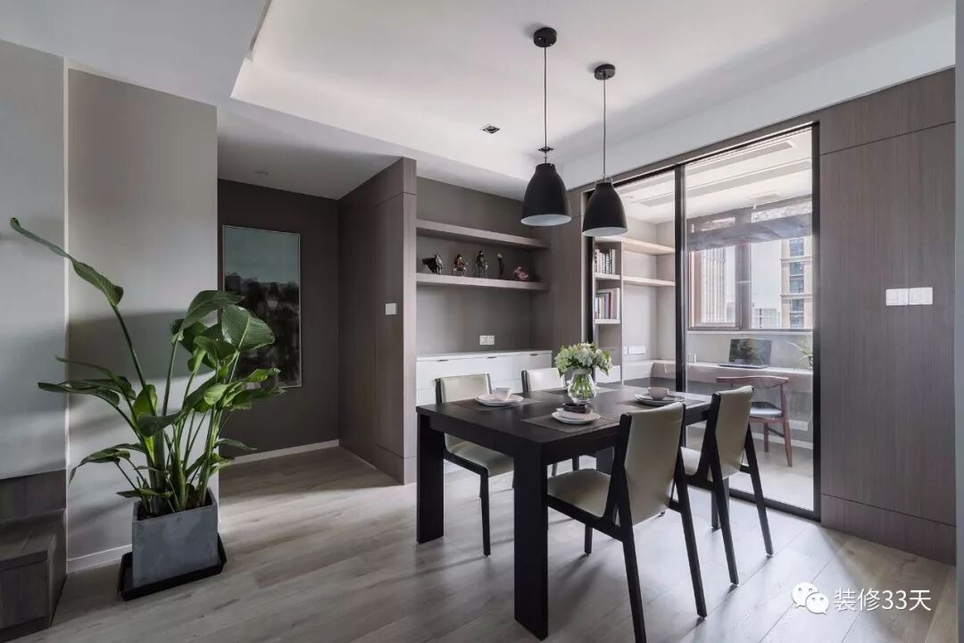 ▲ 餐厅使用简洁的黑橡木桌椅,实木元素的运用使空间更显沉稳质感