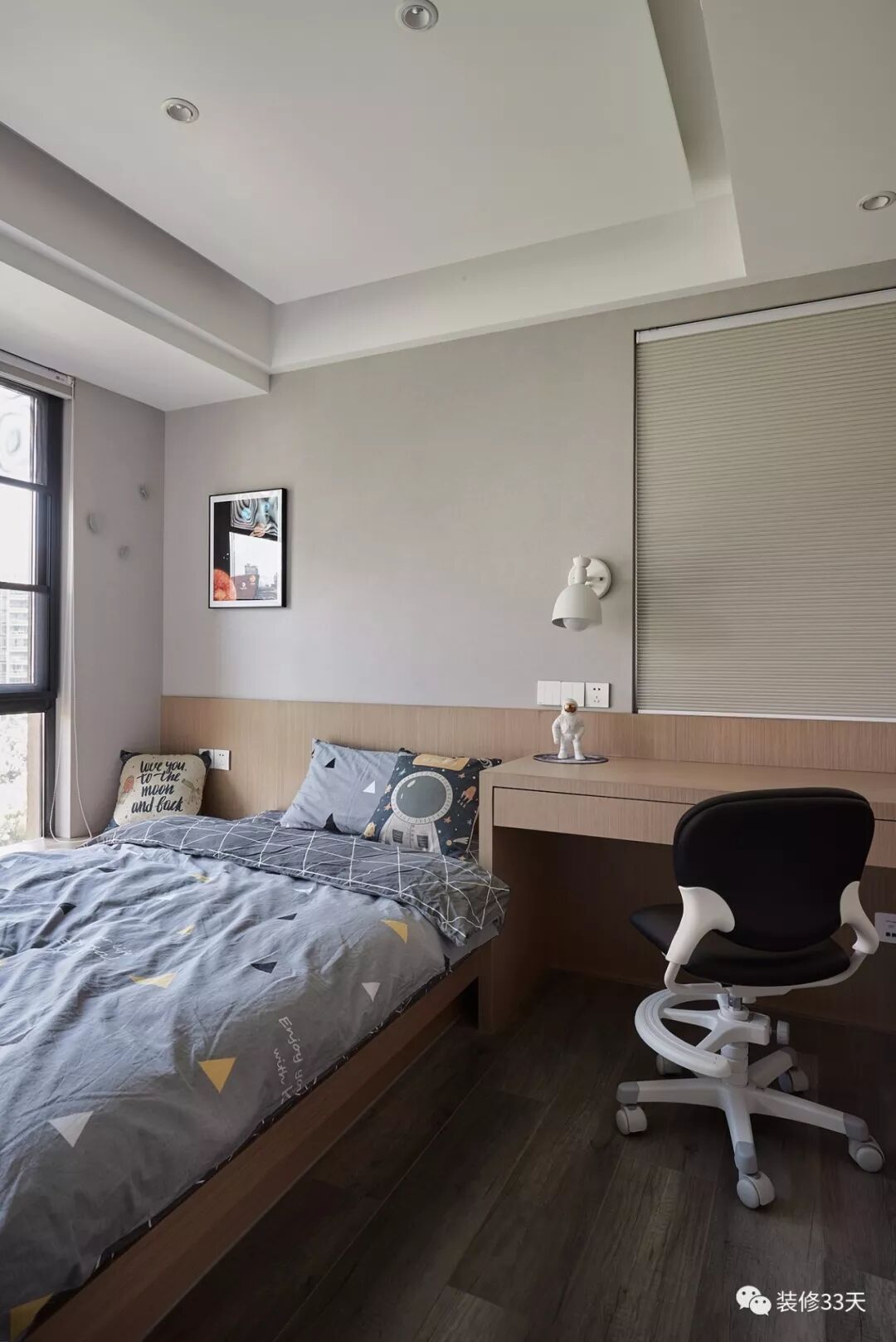 ▲ 儿童房,木色榻榻米连接书桌,半墙木皮搭配浅灰褐墙面,以装饰画与壁灯点缀