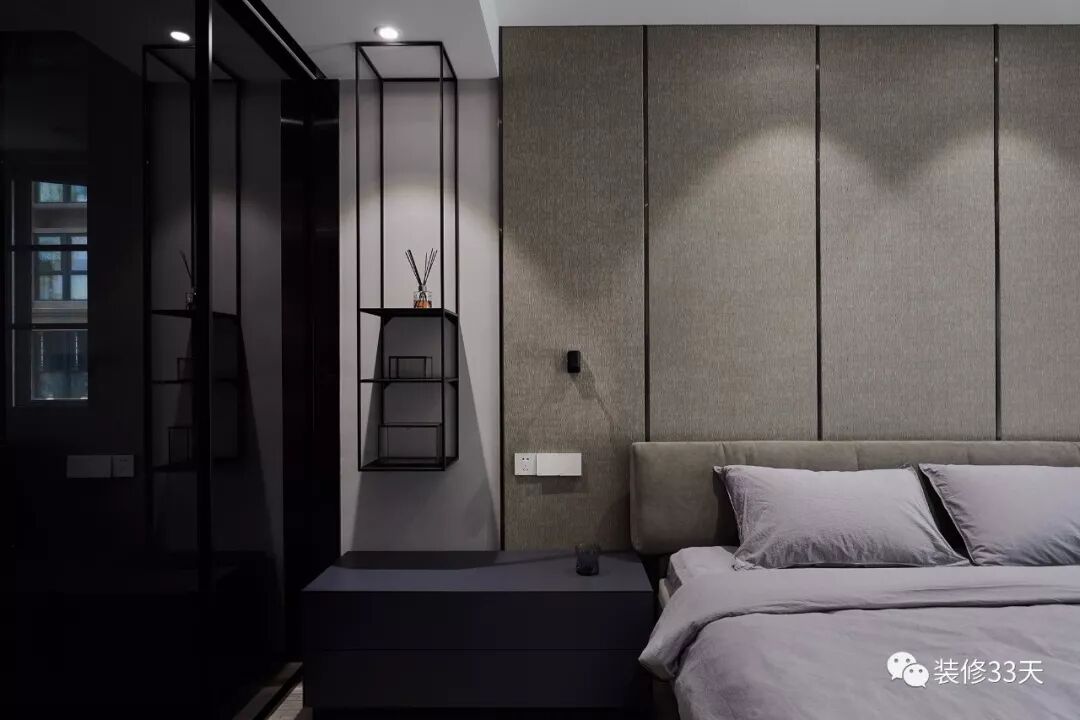 ▲ 主卧,青灰色硬包勾勒黑色线条,色调与床背保持一致,将飘窗打造卧室的休闲一隅