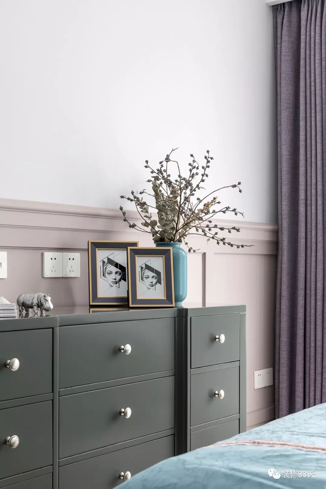 ▲ 床尾半高灰粉色护墙搭配成品斗柜,复古绿加金属拉丝钮扣拉手