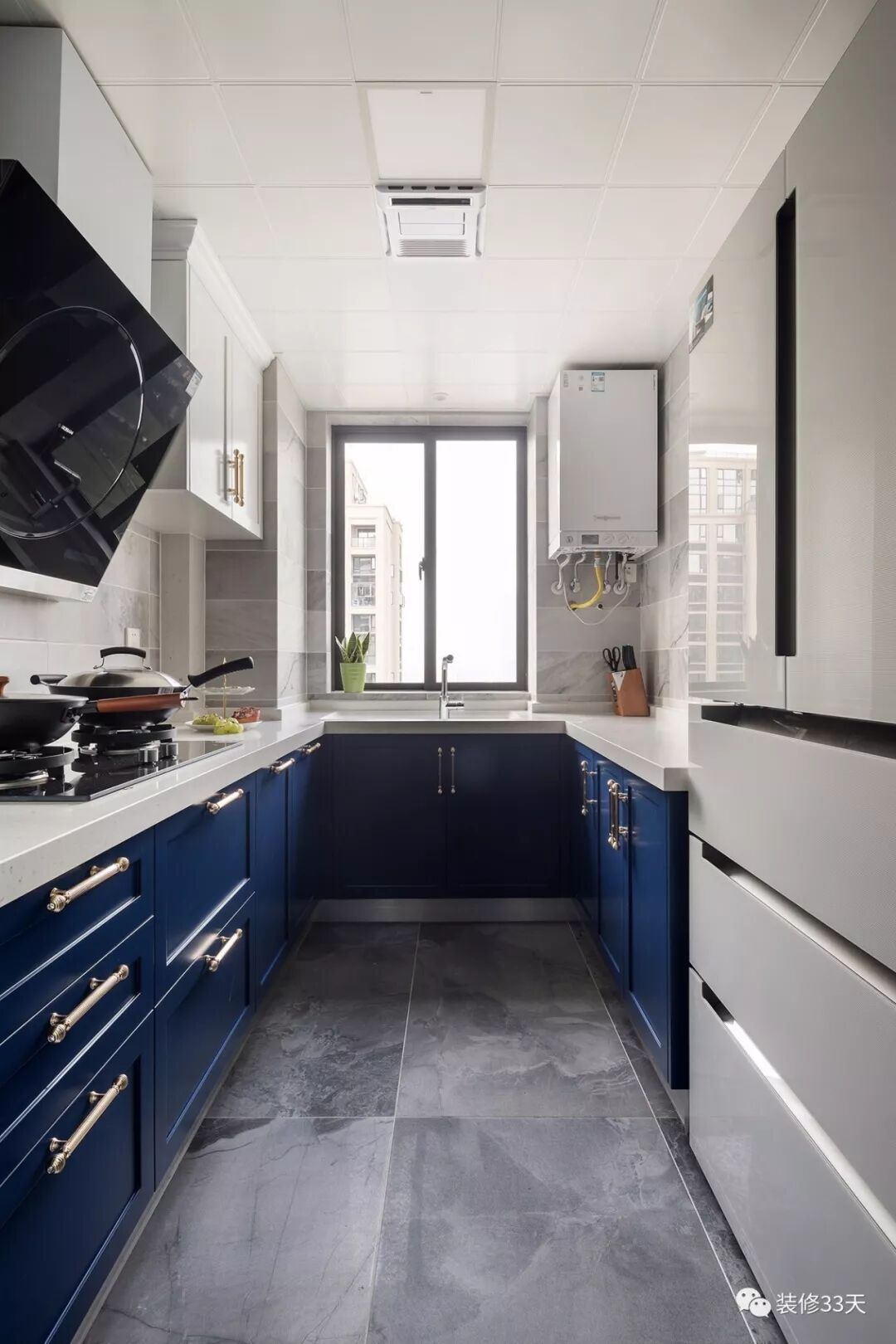 ▲ 厨房整体定制的宝蓝色橱柜搭配纯白色吊柜,另一侧则安放冰箱,充分利用空间的每一寸,保证利用率与审美兼得