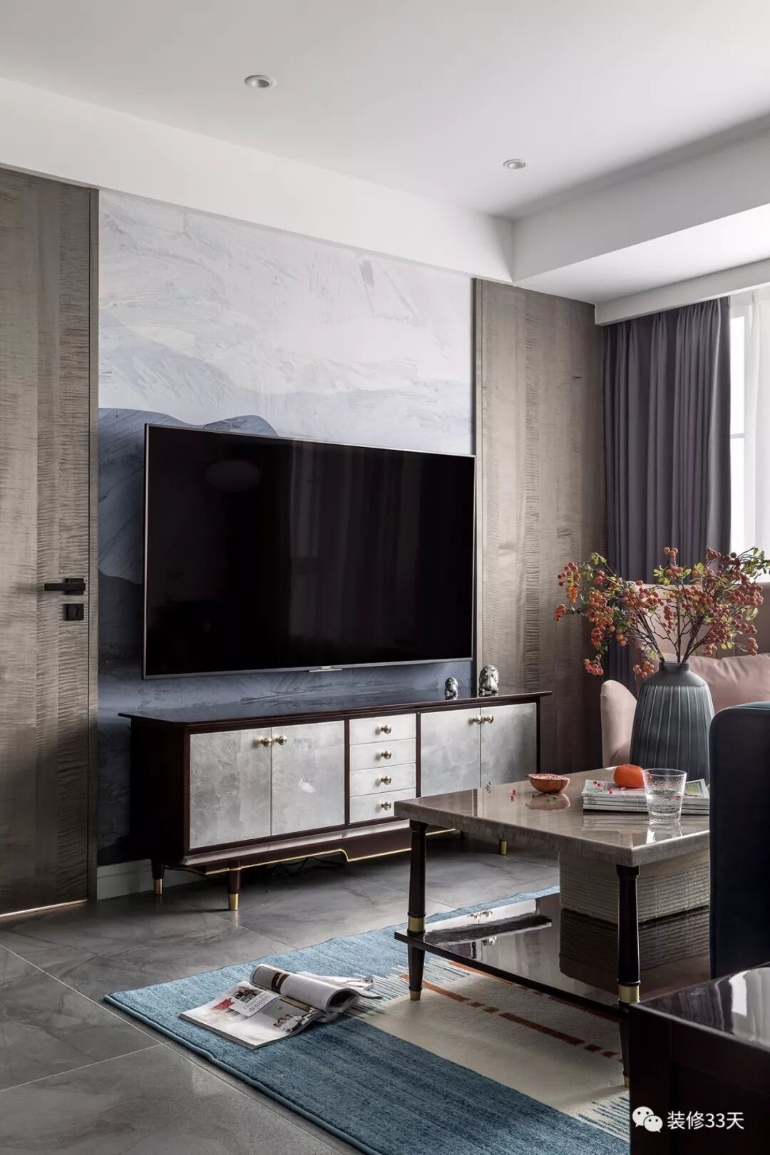 ▲ 采用木皮结合定制壁画打造对称式电视背景,左侧隐藏客房门片