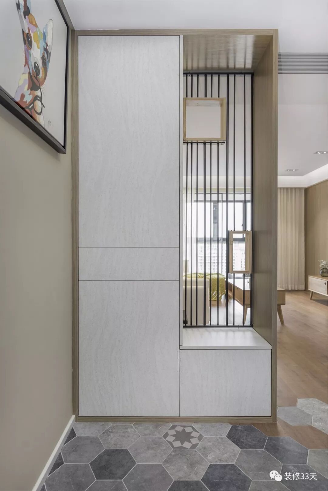 ▲ 使用面积160平,玄关设置木纹包边L型柜体和不规则黑铁格栅作隔断,缓冲视线又不影响空间通透