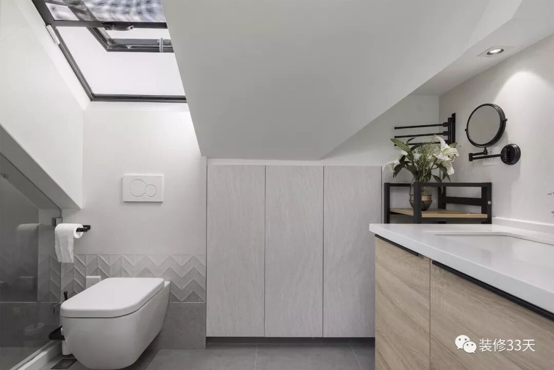 ▲ 主卫,以白色为基调,头顶的天窗提亮空间,墙面设置浅调木纹柜