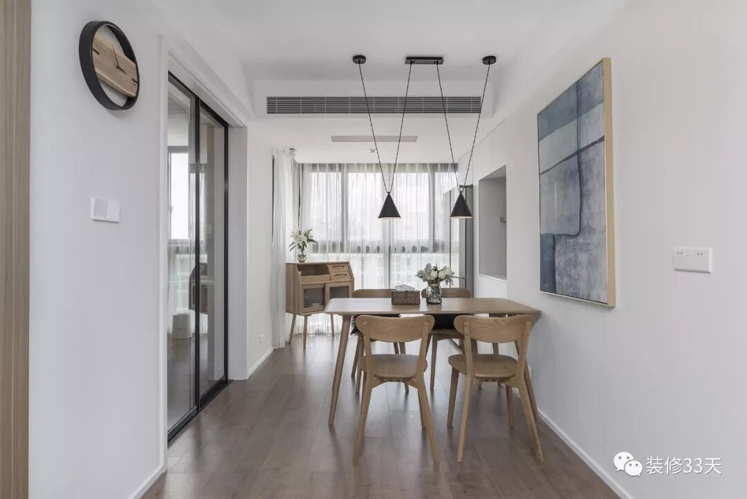 ▲ 餐厅,木质餐桌椅搭配黑色吊灯,留白墙面点缀装饰画与创意时钟