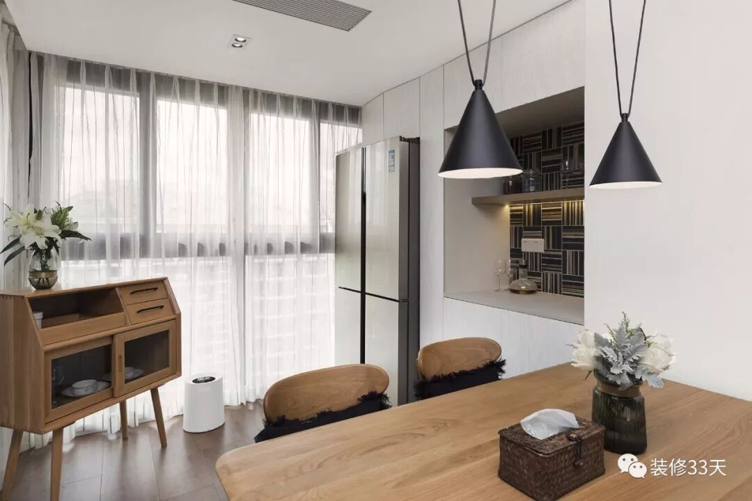 ▲ 墙面白色柜体纳入冰箱,留空部分设计层板变成酒柜,一侧放置成品餐边柜,增添餐厅收纳
