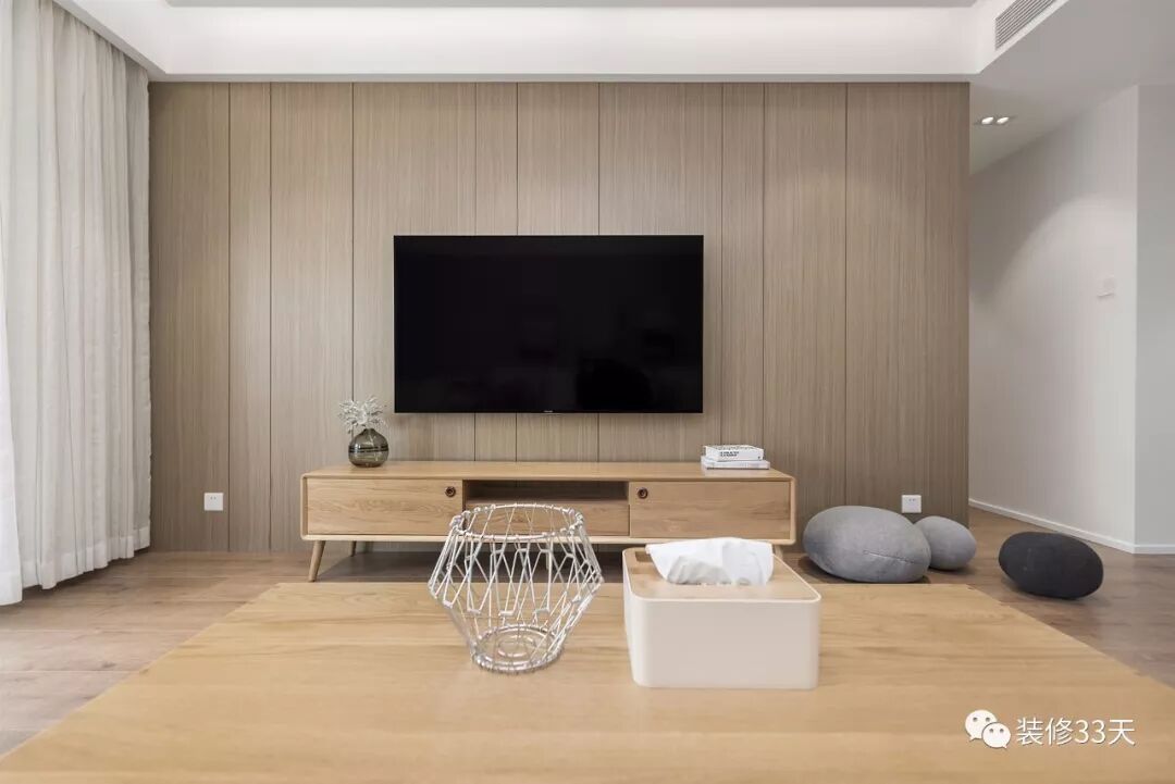 ▲ 木饰面电视背景作拉缝处理,小巧的电视柜,简约实用