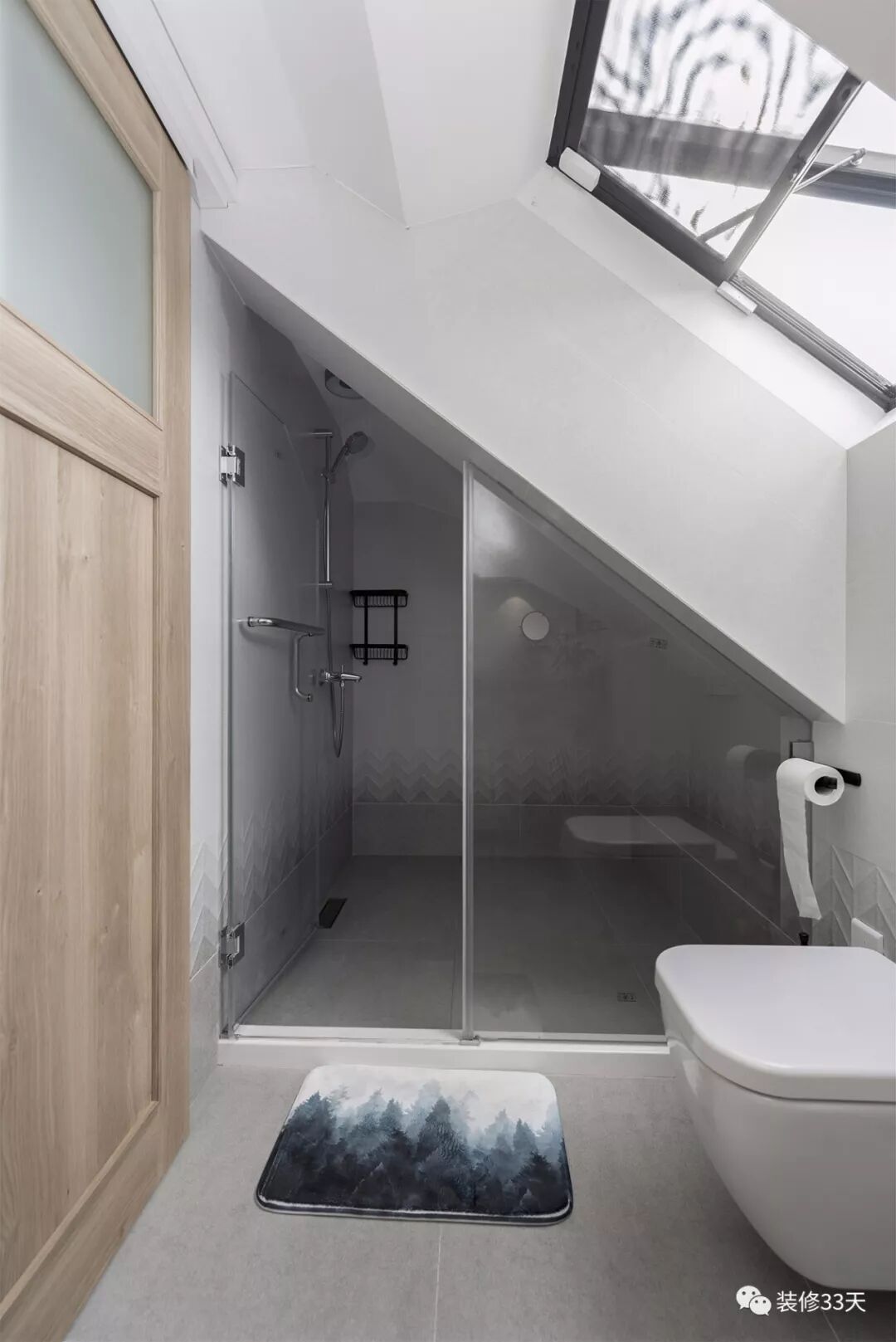 ▲ 斜顶淋浴房采用定制玻璃门隔断,底部铺贴渐变色墙砖,由浅到深层次分明