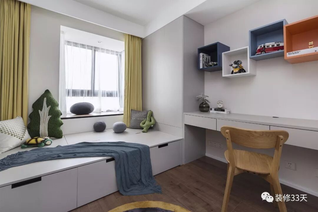 ▲ 书房,定制榻榻米延伸设计柜体与书桌,彩色组合框架放置玩具与书籍