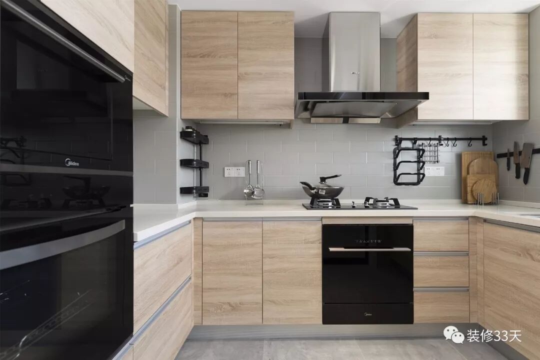 ▲ U型厨房,整体定制木纹橱柜内嵌厨电,木与黑的搭配,经典大气