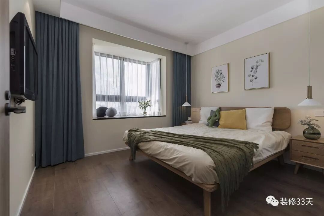 ▲ 次卧,整体铺贴米白色墙纸,绿植装饰画与床头柜上的绿植相互映衬,一动一静