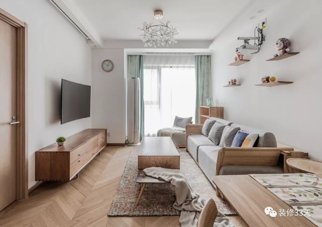 ▲ 客厅,地面通铺鱼骨拼实木复合地板,整体色调采用原木色+米灰色与白色搭配