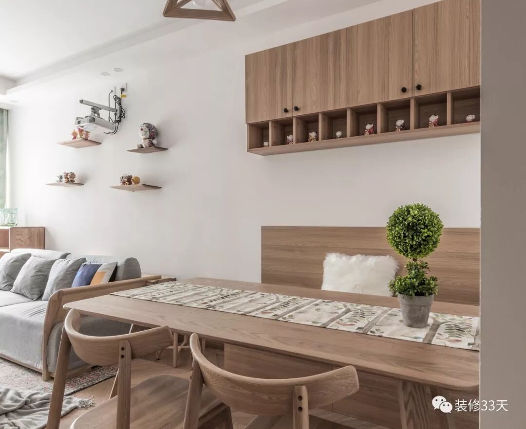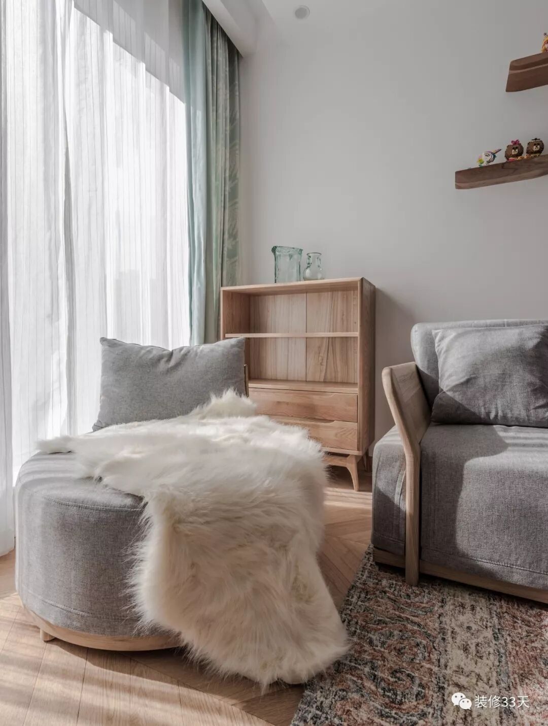 ▲ 留白墙面点缀原木层板修饰背景,又可展示置物,搭配灰木色家具给人以优雅舒适的居家感