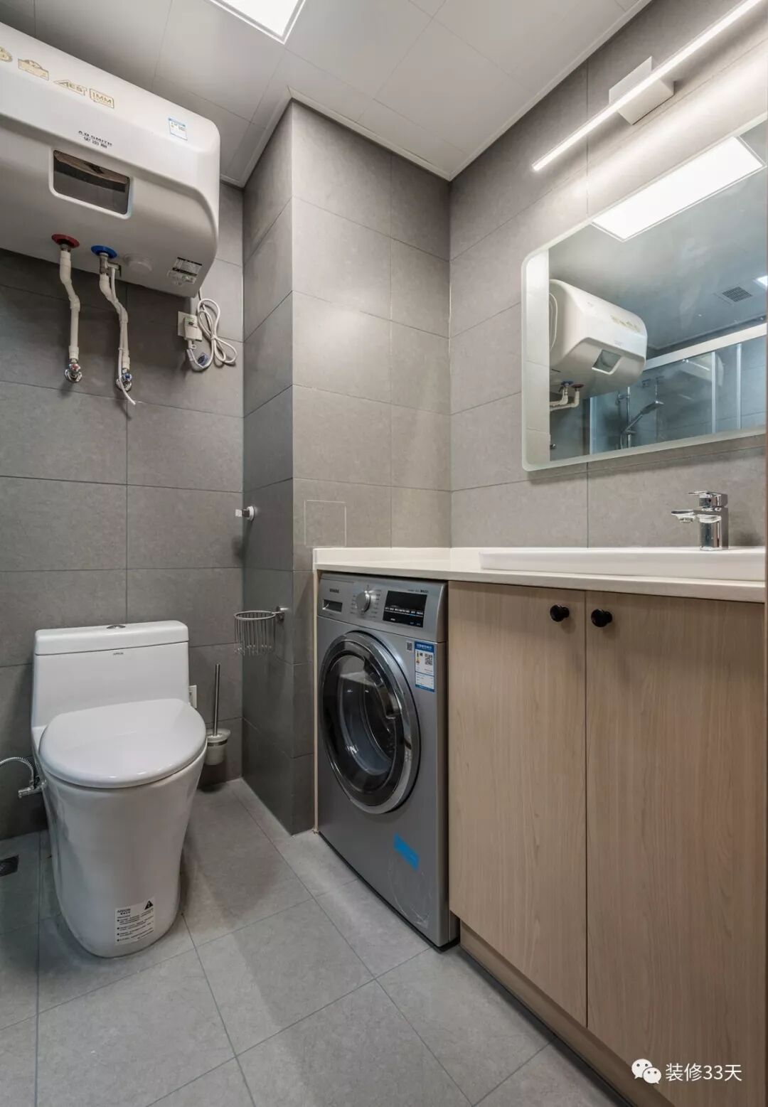 ▲ 卫生间,灰色与木色搭配,将浴室柜的台面整体延伸出来,嵌入洗衣机,规划出洗浴洗衣的复合机能