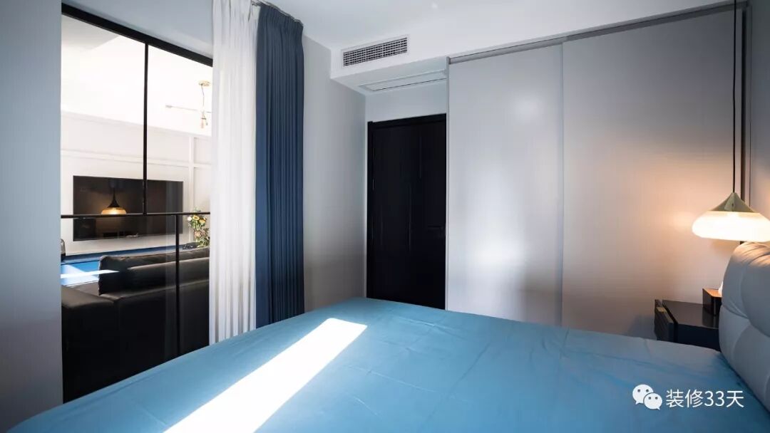 ▲ 床尾设置白纱与藏蓝色窗帘,解决空间私密性