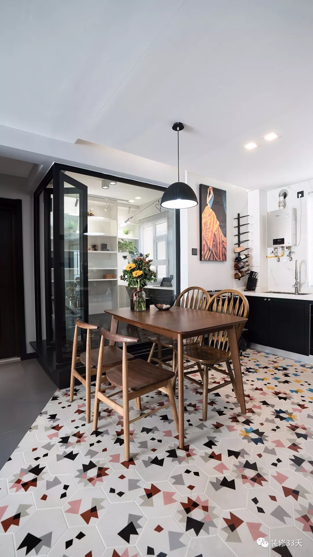 ▲ 客厅望向餐厨区,视野开阔明亮,地面用彩色六角砖做了几何分割,打破常见客餐厅的区域划分