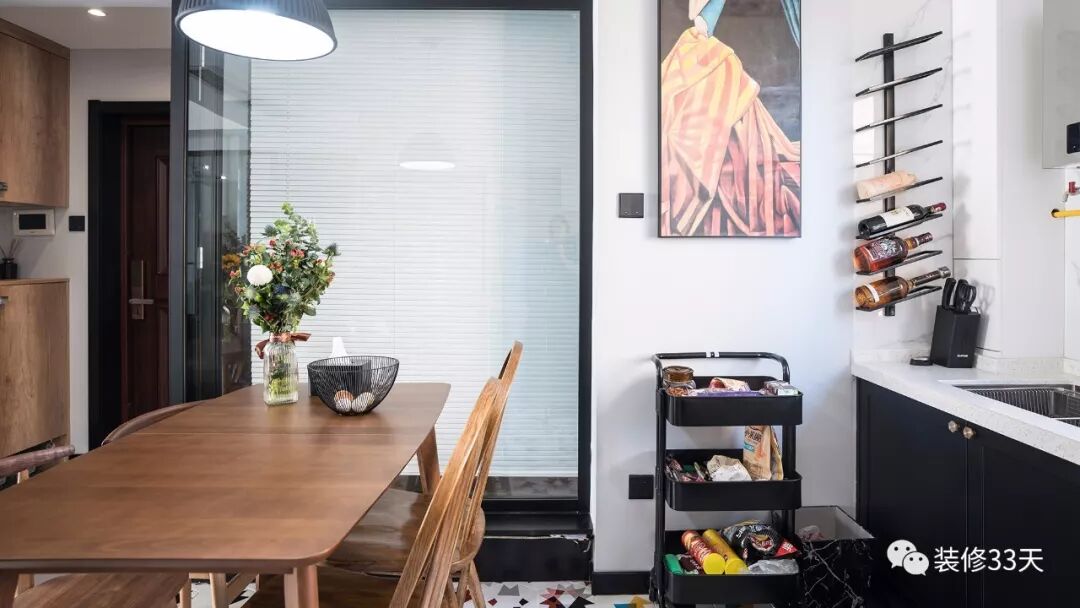 ▲ 一旁放置黑色宜家推车,做零食收纳区,利用水槽左侧的空间做8格酒架,将空间利用最大化