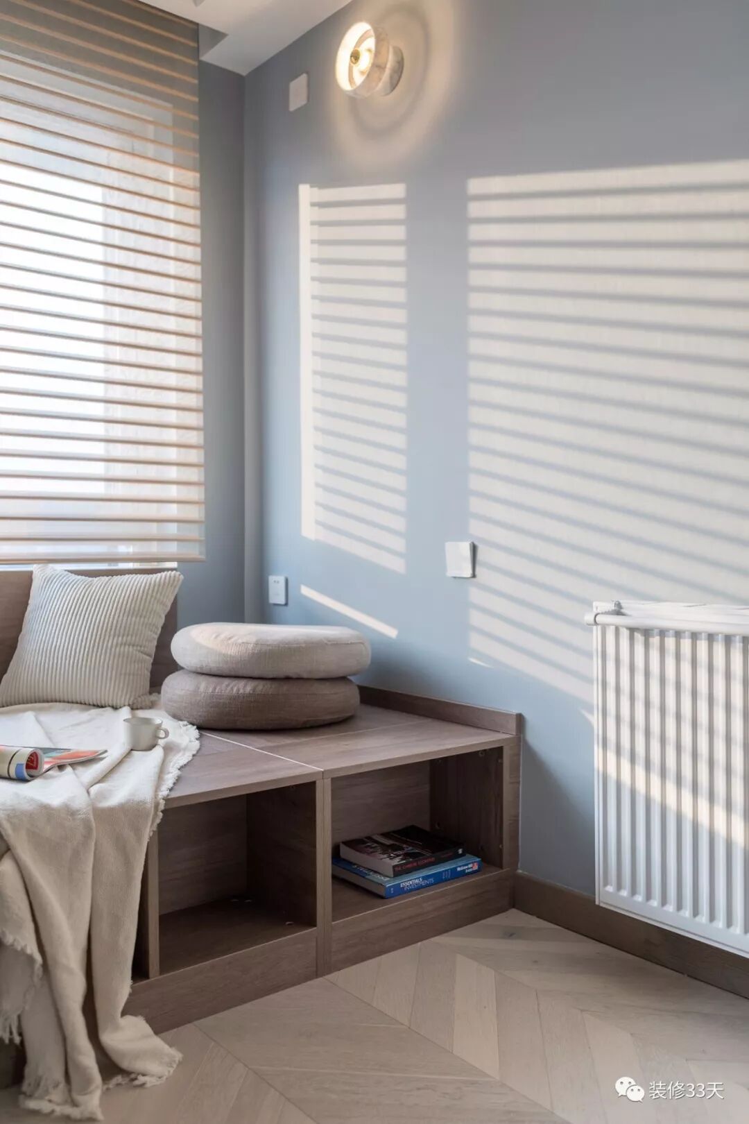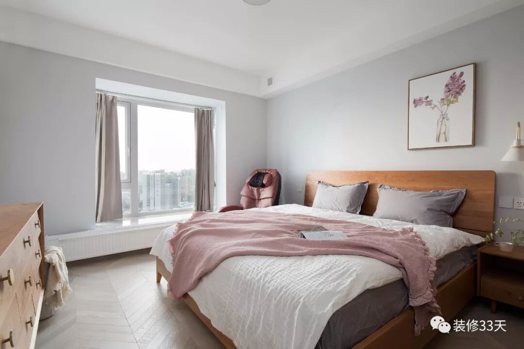 ▲ 清简质朴基调的次卧设计成父母房,地面延续鱼骨拼木地板,床尾收纳矮柜增加卧室空间的趣味感