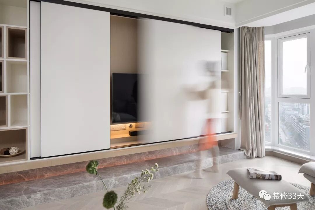 ▲ 电视墙做了移门,可以把电视隐藏起来