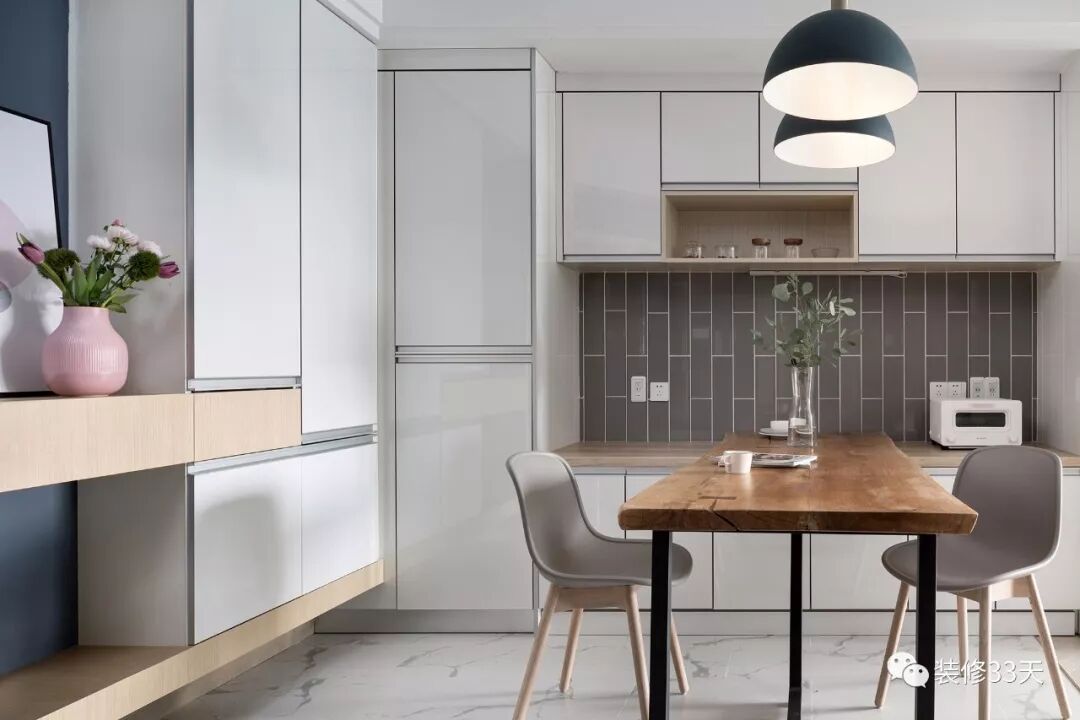▲ 餐厅围绕现场制作的柜体,用实木台面直接搭在餐边柜上做餐桌,墙面砖是用瓷砖胶贴的,能防止柜体受潮