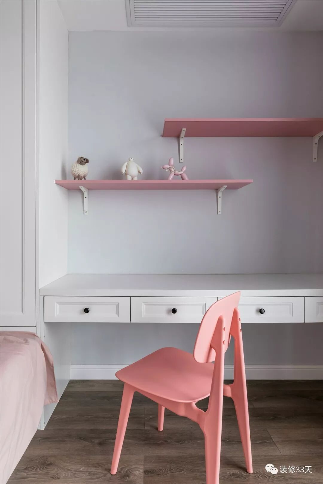 ▲ 书桌上方错落安装粉色调置物层板,丰富背景的同时与粉色调家具保持呼应