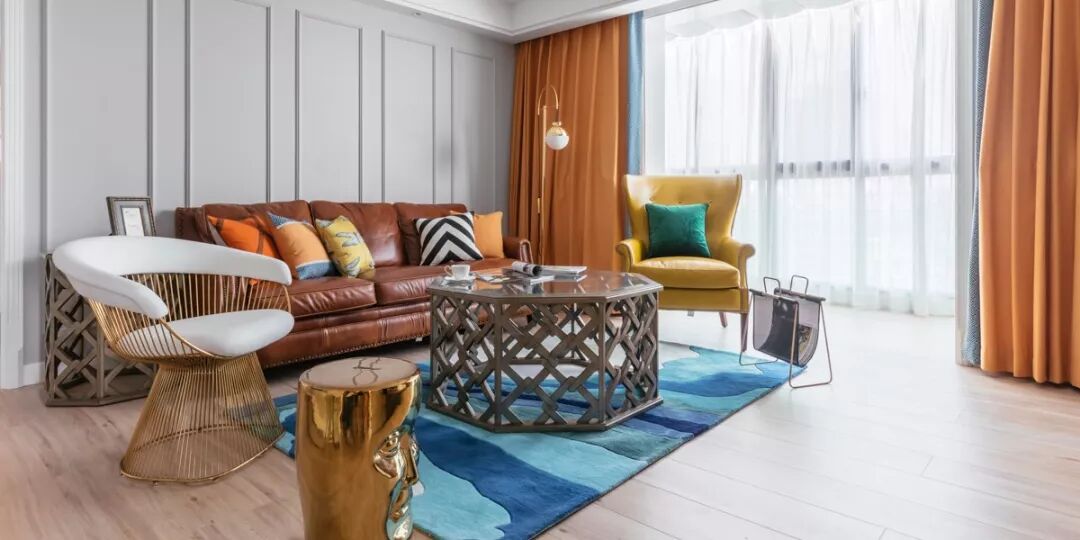 ▲ 白色纱帘配明黄色窗帘,灰色系格子单椅配黑白菱形腰靠,后方是简化后的壁炉元素电视背景墙