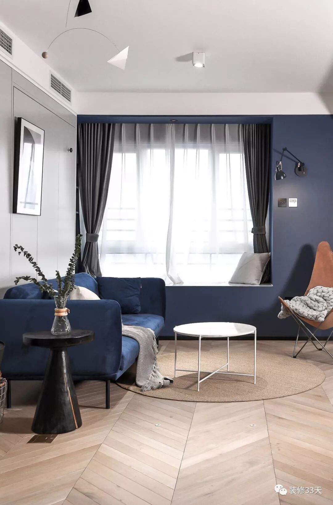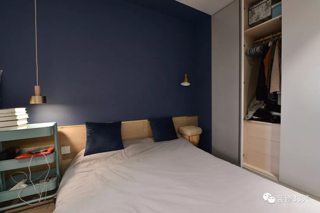 ▲ 深蓝色天鹅绒小细腿沙发,高贵而优雅,靠窗一侧打造飘窗,整面墙刷成深蓝色,既是背景,也自成一体