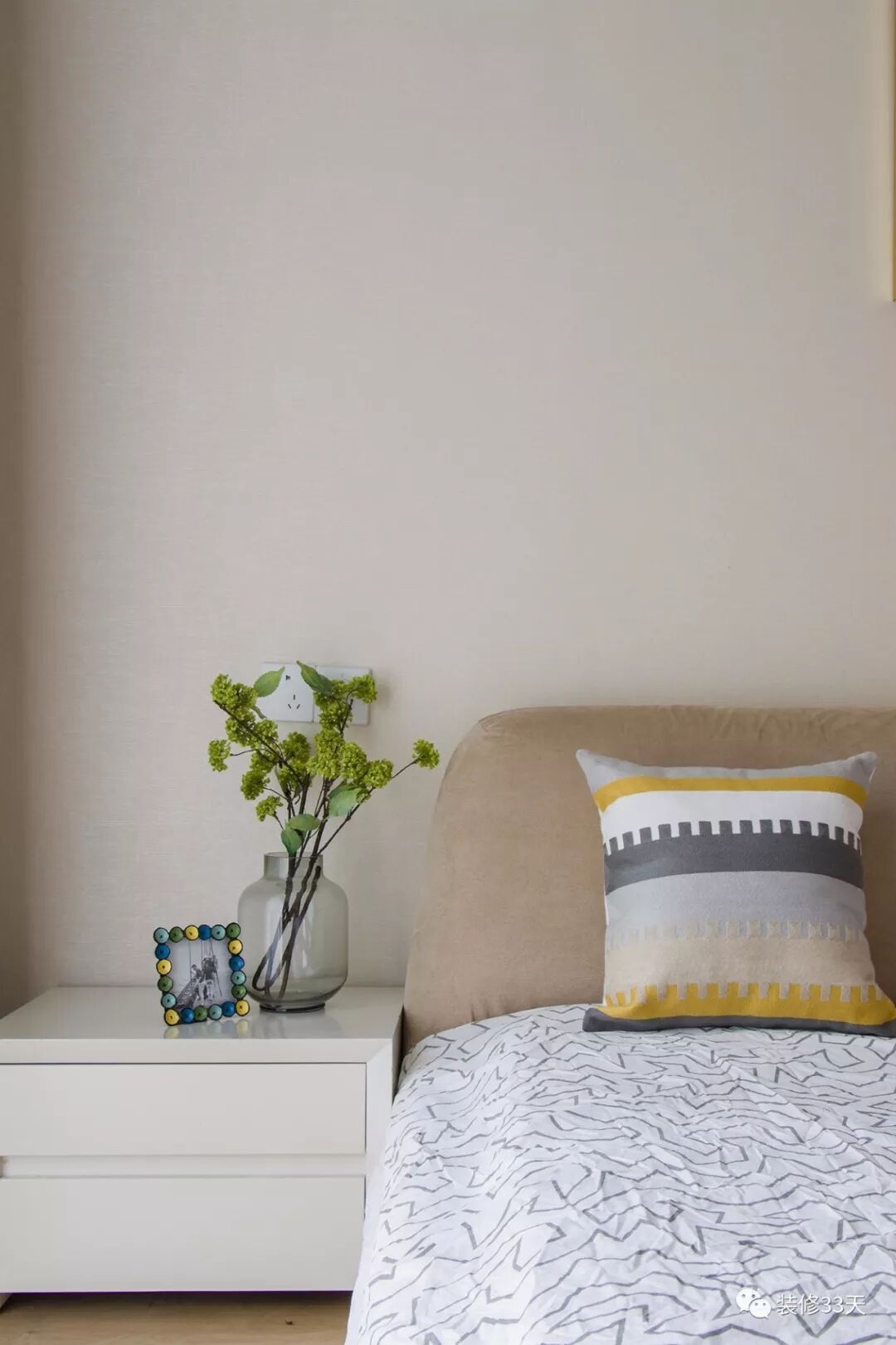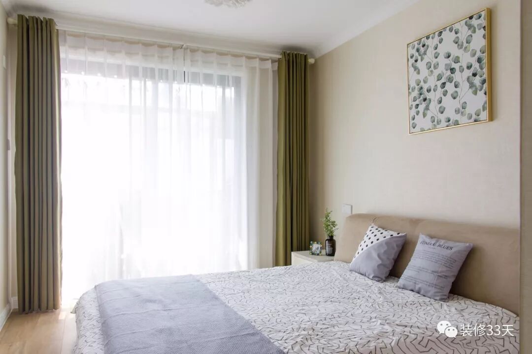 ▲ 主卧采用米白暖色为基调,点缀草绿色窗帘,与叶片装饰画的清新感相辅相成