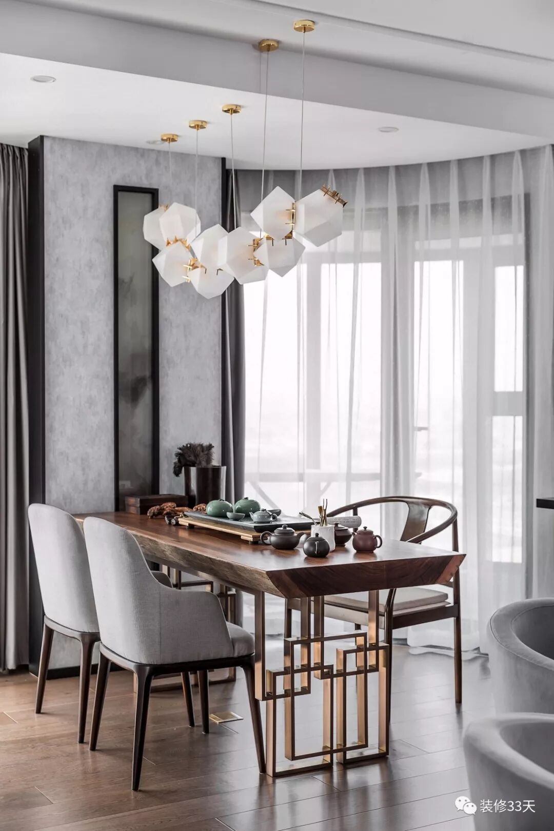 ▲ 边上设置原木吧台,精致茶具与吊灯,搭配白纱带来的柔和光线,形成悠然自得的品茗区