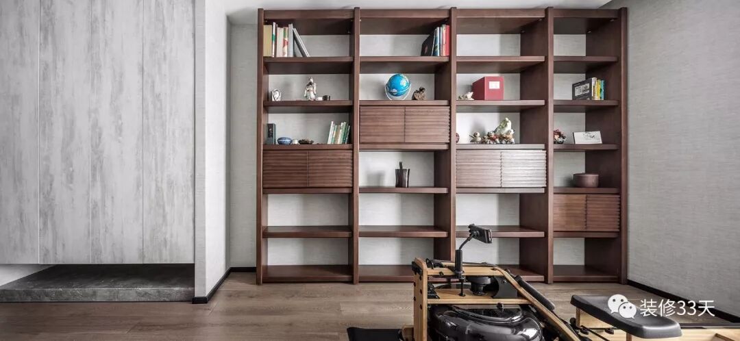 ▲ 多功能房,定制灰色系柜体与开放式原木书架,搭配健身器材,使空间收纳、休闲、娱乐功能齐全