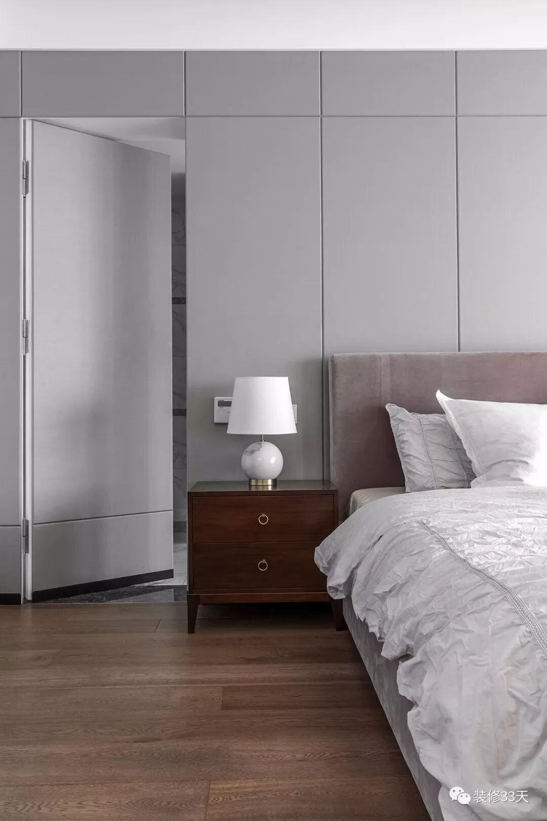 ▲ 浅色系硬包背景墙设置主卫隐形门片,与背景线槽相连,隐形效果好
