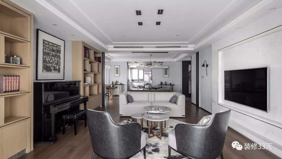 ▲ 围合式沙发摆放,一侧放置钢琴与定制书架,丰富空间功能,提升家人间的交流互动氛围