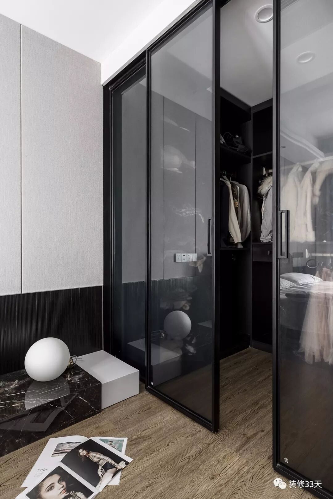 ▲ 深灰色夹丝玻璃与黑色定制衣柜的组合更像是一处秘境