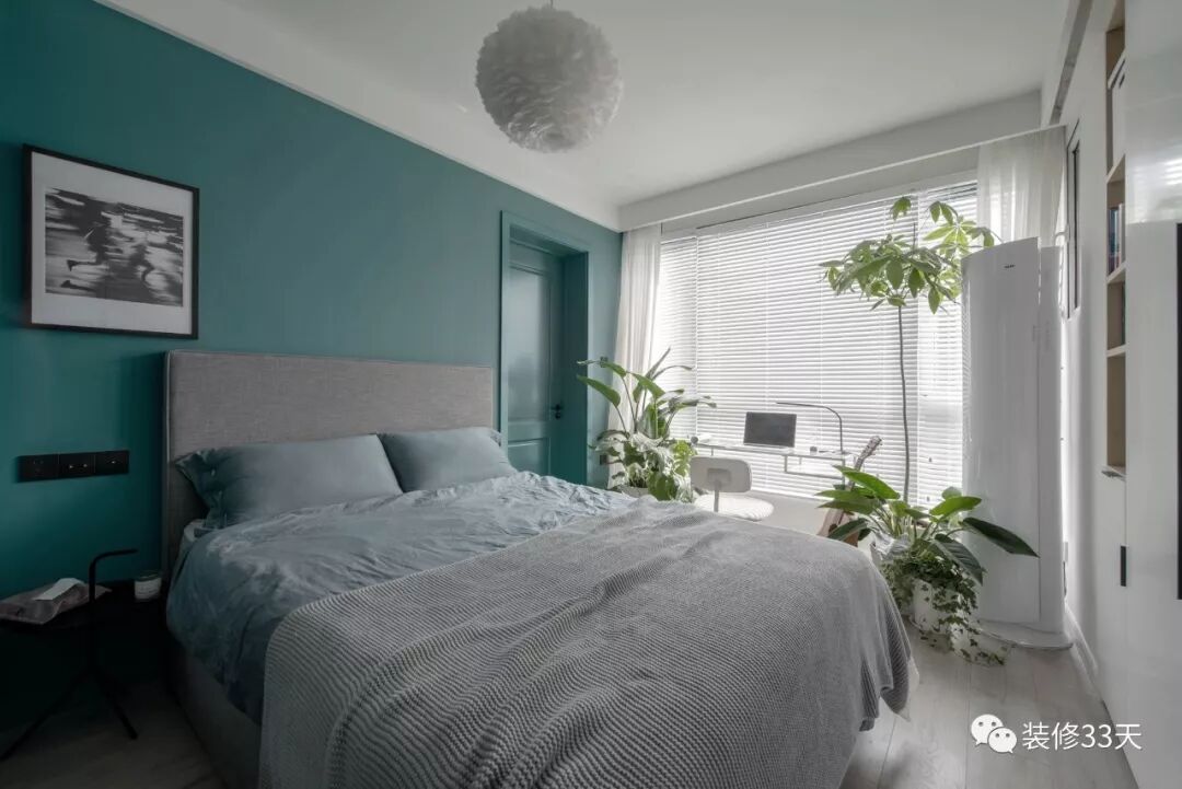▲ 卧室景观窗安装白色百叶,增设出休闲办公区,辅以大面积绿植,制造森系空间