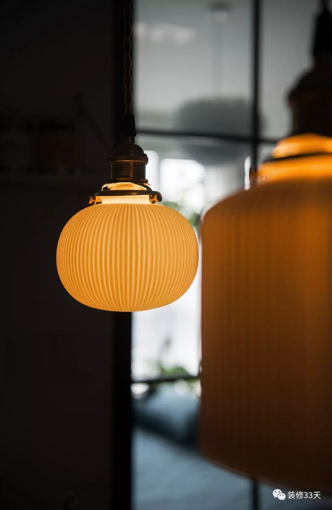 ▲ 吧台上方装两盏线性暖光吊灯,提升空间格调与氛围