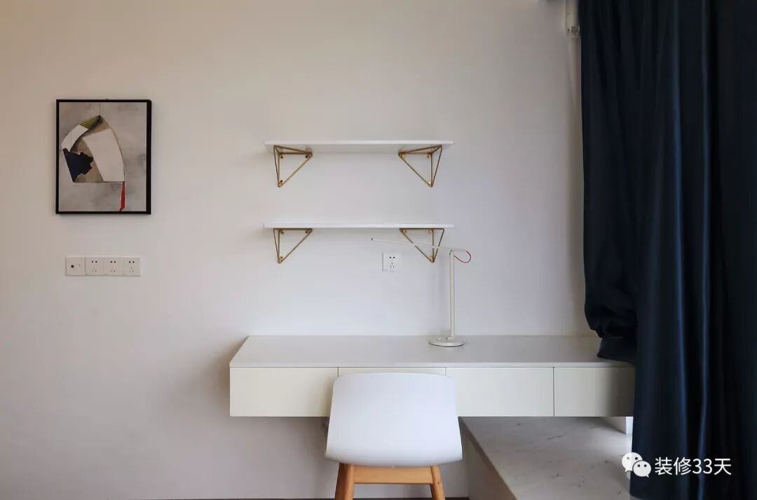 ▲ 儿童房一角,设计悬浮书桌,采用装饰画与置物层板来丰富墙面
